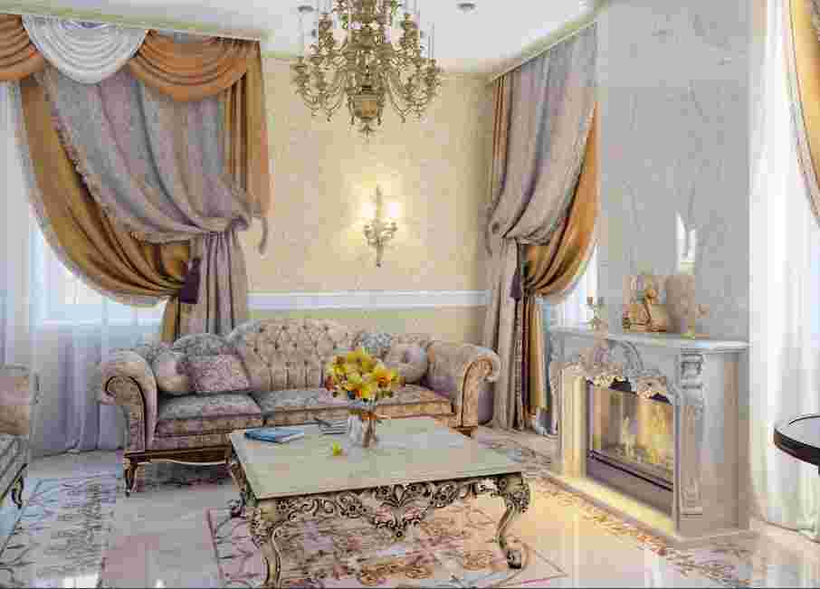 - Для обивки и в дизайне текстиля используются дорогие ткани с роскошной фактурой: гобелен, велюр, натуральный шелк. И шторы, и обои могут быть из этой ткани.