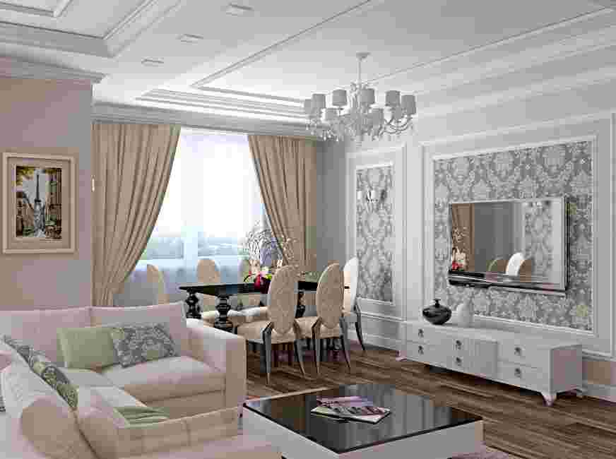 Светлые оттенки способствуют визуальному увеличению пространства и гармонично вписываются в зал, имеющий любую планировку. Для того, чтобы обстановка не смотрелась безликой и скучной, дизайнеры рекомендуют свести количество белоснежного цвета к минимуму и добавить в интерьер сложные пастельные тона.