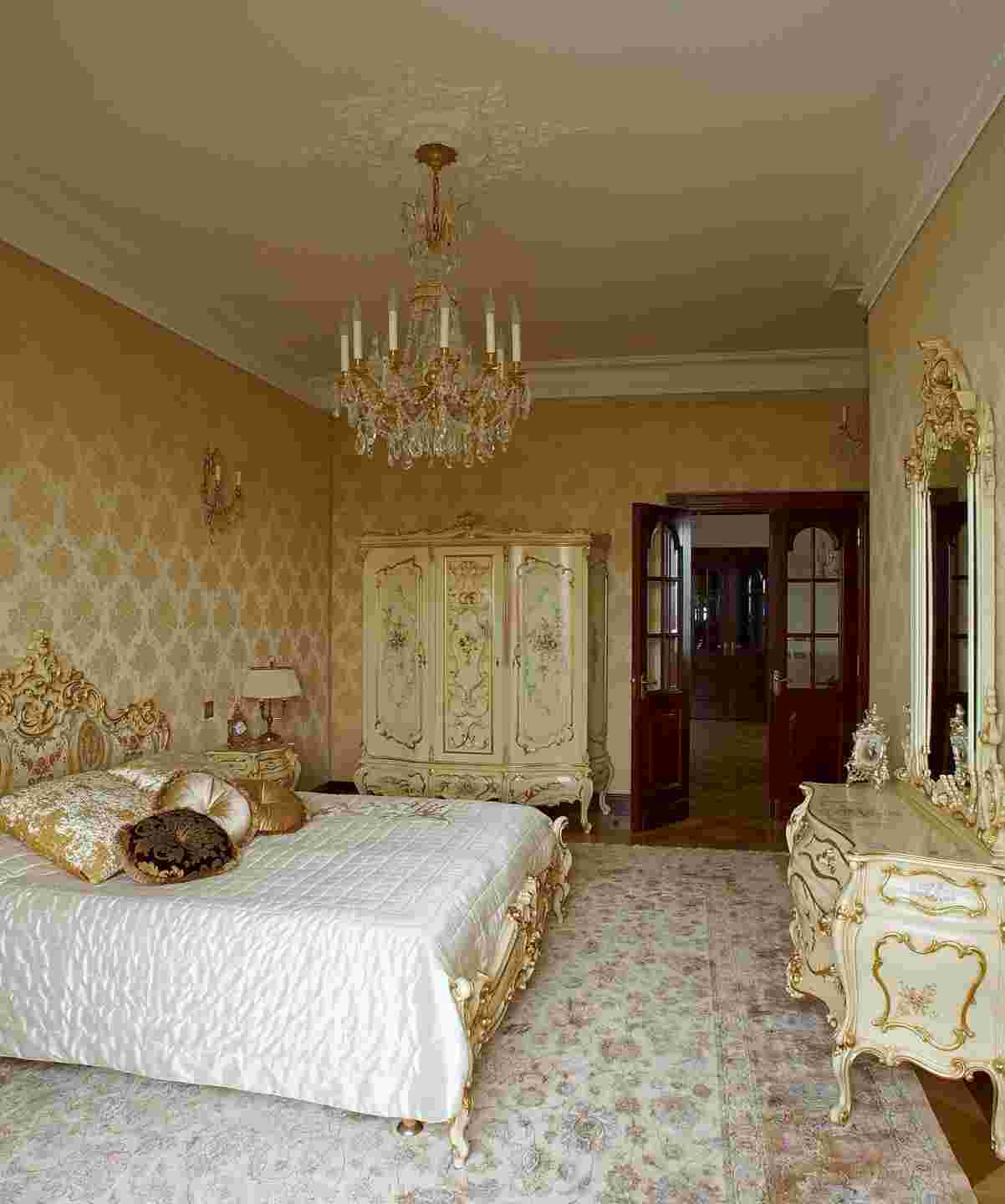 - Мебель для спальни должна быть обязательно деревянная, причем из массива и дорогой породы. Резьба применяется в изголовье и на ножках, в оформлении двери, служит отличительной особенностью стиля барокко.