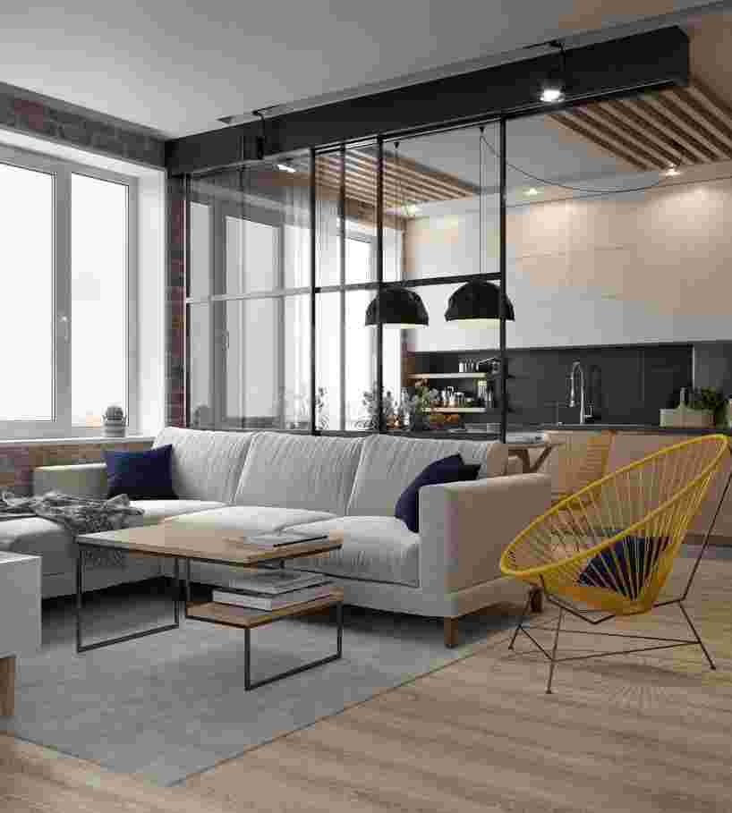 Распространенный прием – расположение дивана в центре комнаты, лицом в гостиную и спинкой к кухне.