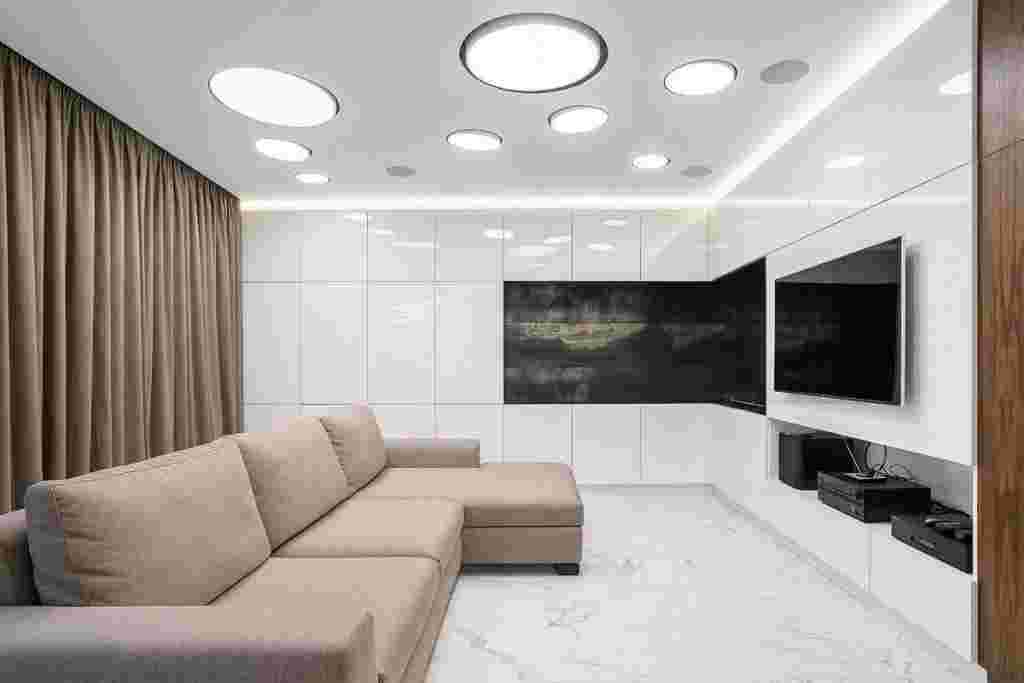 Современная минималистичная гостиная в первозданном белом цвете (от Lignum Elite).