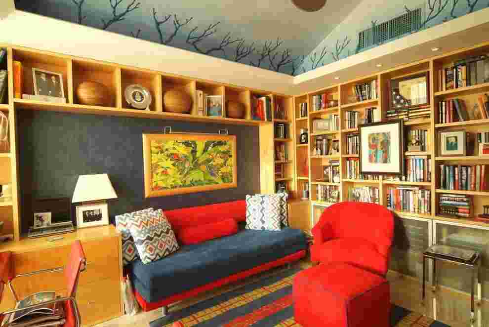 - при отсутствии в доме библиотеки или кабинета, владельцы всегда могут обустроить такую комнату в гостиной. Для этого понадобится лишь грамотно расставить книжные полки, которые изготавливают во всю высоту стены.