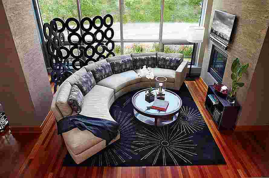 - Круговая меблировка позволит создавать уютные зоны. Центром дизайнерского решения может быть ковер, камин или телевизор, вокруг которого устанавливается вся мебель.