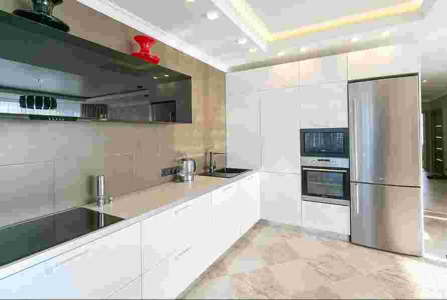 В зонировании кухни можно задействовать потолок. К привычному решению зонирования с выделением уровня добавится цветовая составляющая. Белый потолок как нейтральная часть кухонного пространства не несет особой визуальной нагрузки.