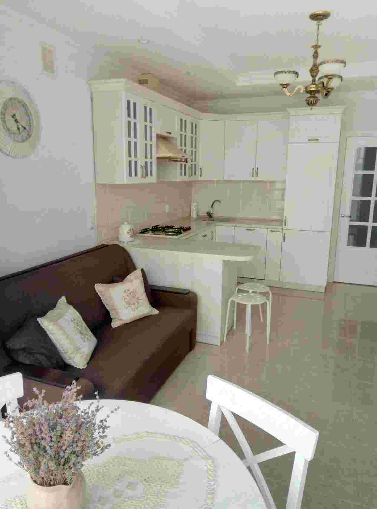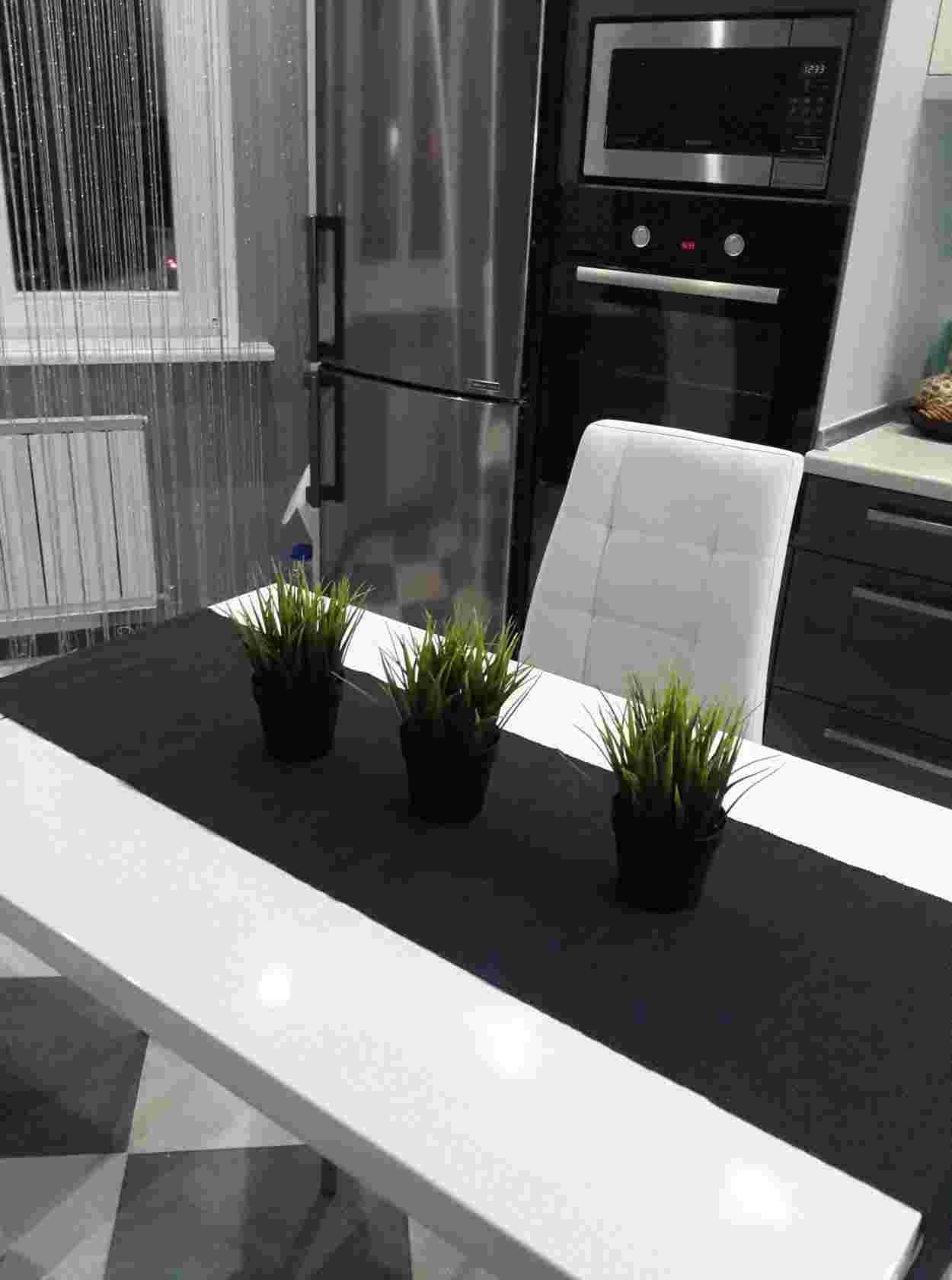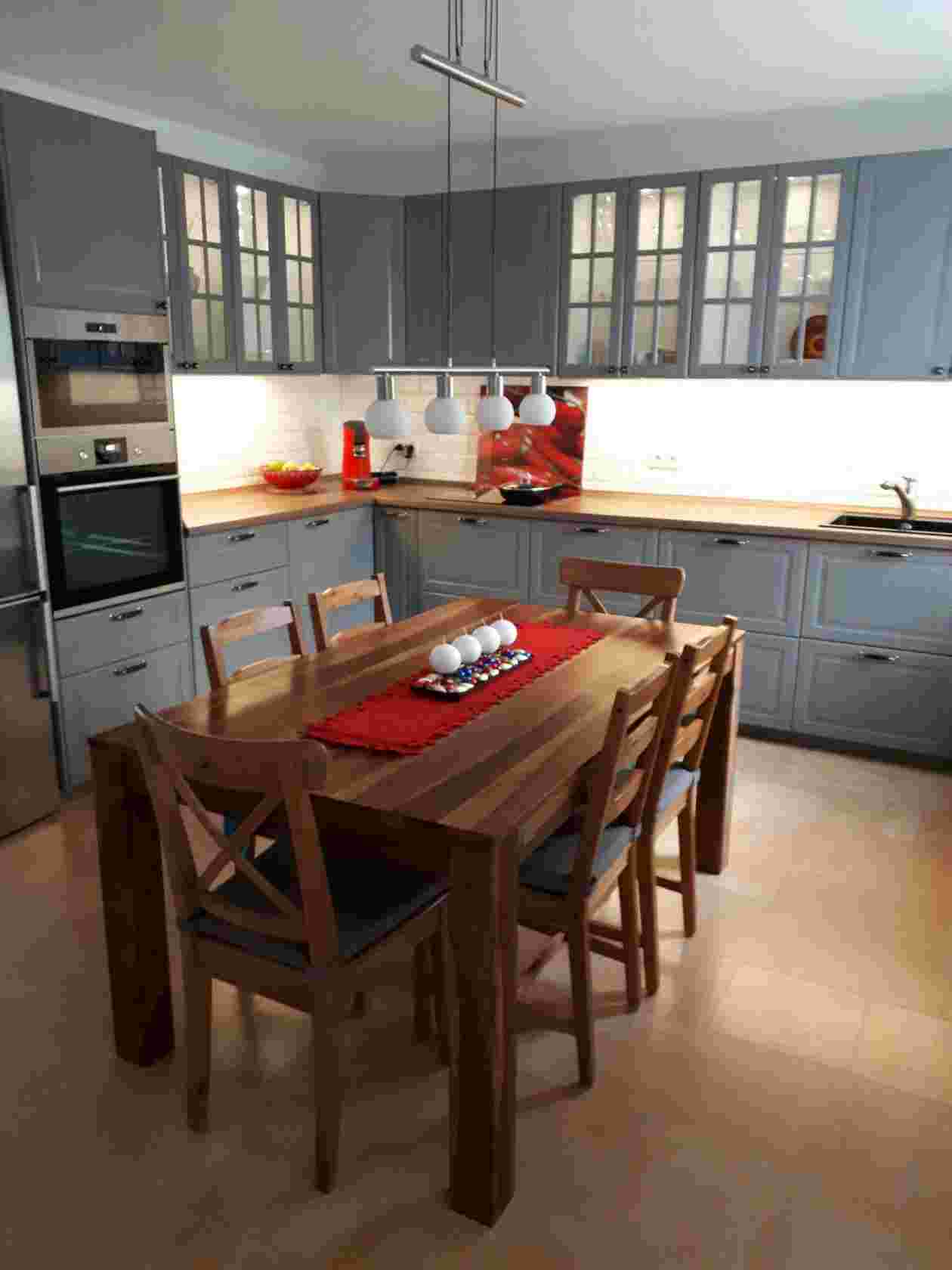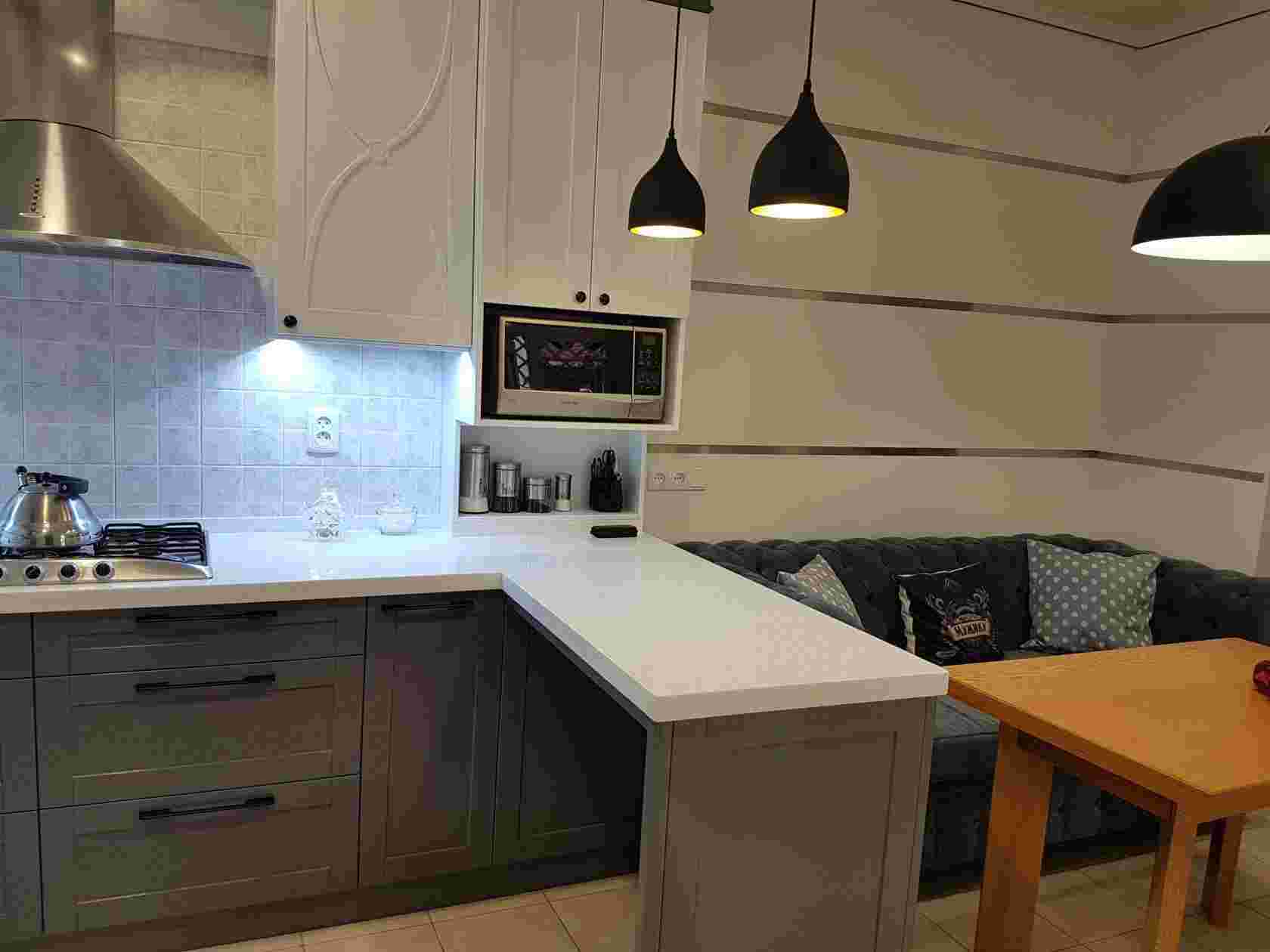 При достаточной площади помещения обеденный стол можно поставить недалеко от кухонного гарнитура, тогда его поверхность тоже может быть рабочей. Часто над столешницей можно наблюдать развешенные мелкие кухонные предметы, а также лампочки и дополнительные крючки.