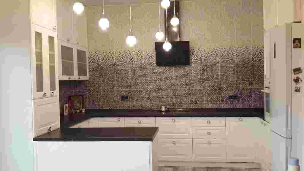 - Оформление фартука требует особого внимания. Здесь лучше задействовать такие материалы, как стекло, керамогранит или кафель. Стоит подбирать что-то с интересным дизайнерским принтом.