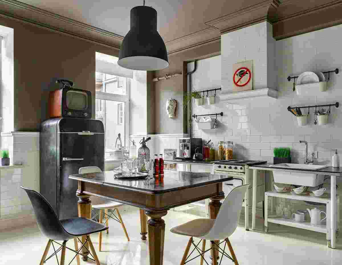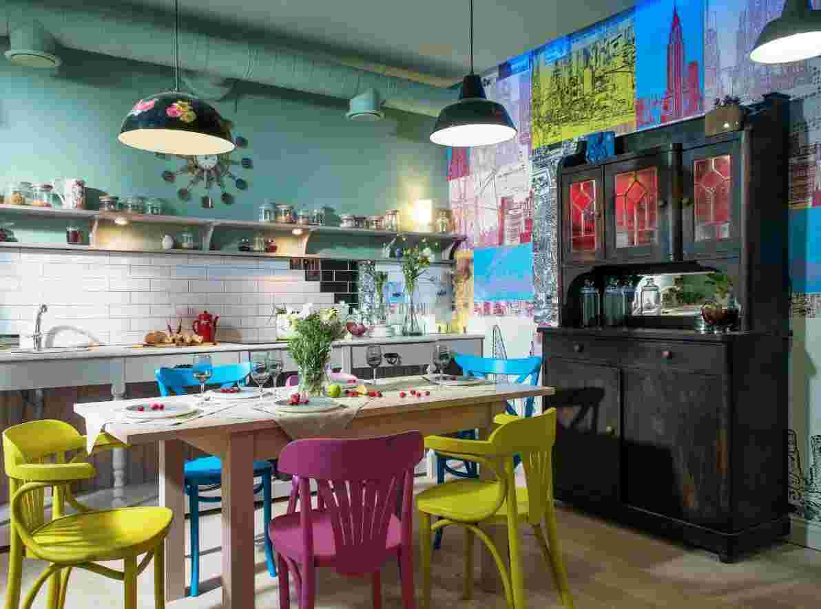 На современной кухне для контраста можно установить ретро-холодильник и тостер. Точно так же будут работать красный холодильник и чайник на фоне белоснежного классического гарнитура. Вариантов можно придумать сотни, от желтого бархатного кресла на фоне мебели в духе хай-тек и кирпичных стен до комплекта из разноцветных пластиковых (деревянных и прозрачных) стульев у обеденного стола, как в примере на фото.