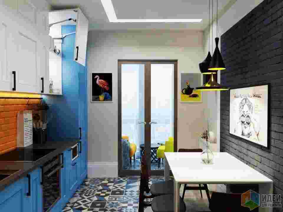 Дизайн кухни в стиле фьюжн предполагает применение классических и нестандартных решений в декоре стен, пола и потолка. Так, потолок может быть простым беленым, крашеным в яркий оттенок или обшитым ламинатом. Для отделки стен используют обои, штукатурку, кафель, обработанный кирпич, как на фото, краску, деревянные и стеклянные панели, гипсокартон, в том числе и конструкции замысловатых форм (ниши, колонны, арки). На пол, поскольку речь идет о кухне, можно положить керамическую и кафельную плитку, паркетную доску, ламинат, паркет.