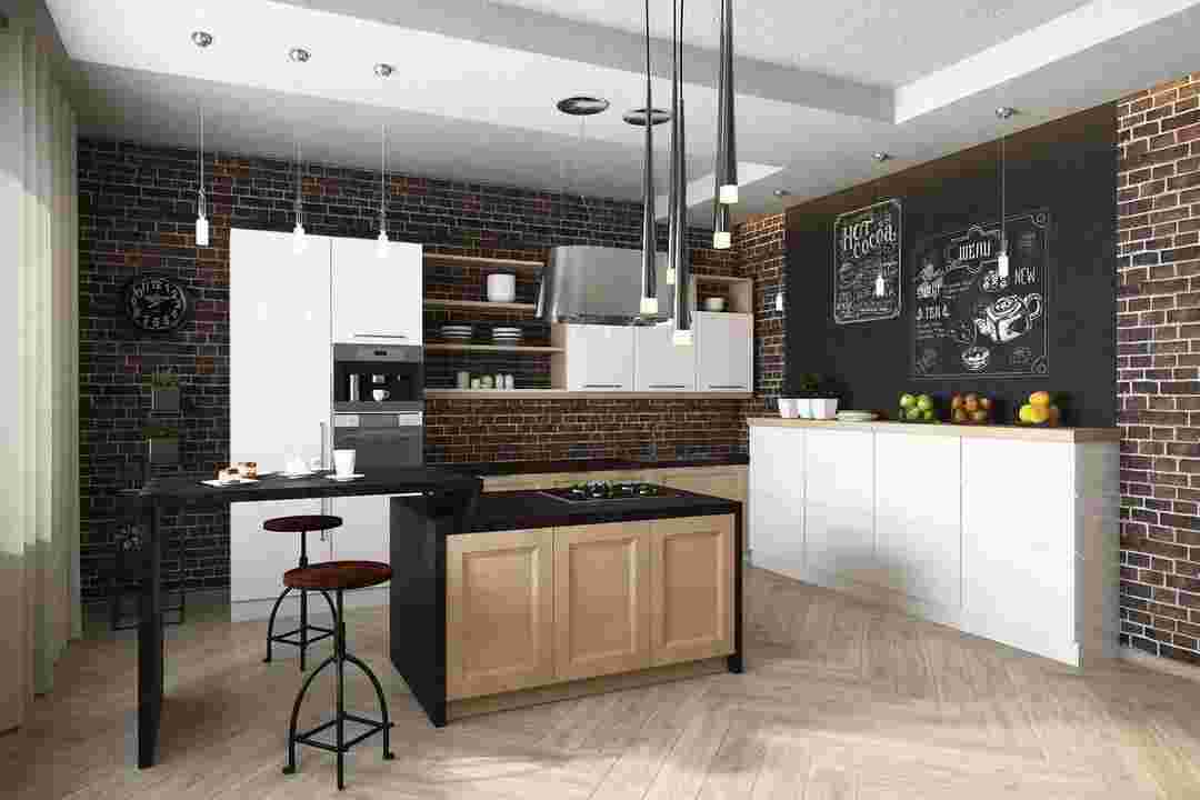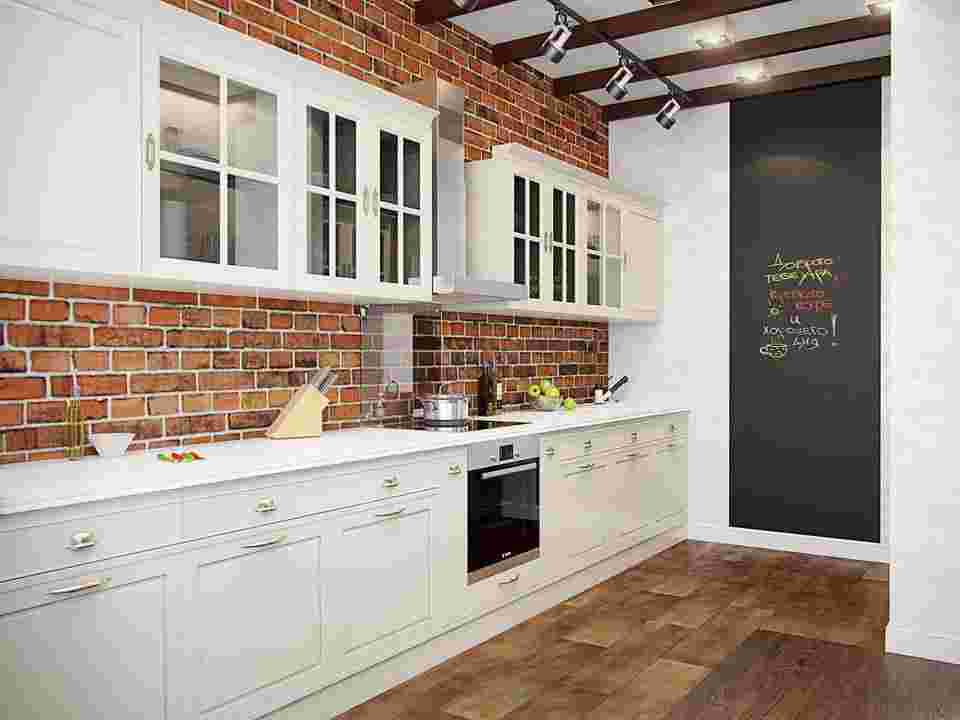 Классический вариант оформления – белая кухня. Центральный элемент интерьера – кирпичная стена, закрашенная светлой краской. Потолок также оставляют светлым. Пол в целях практичности делают темным или нейтральным. В таком помещении органично выглядит мебель из темных пород дерева.