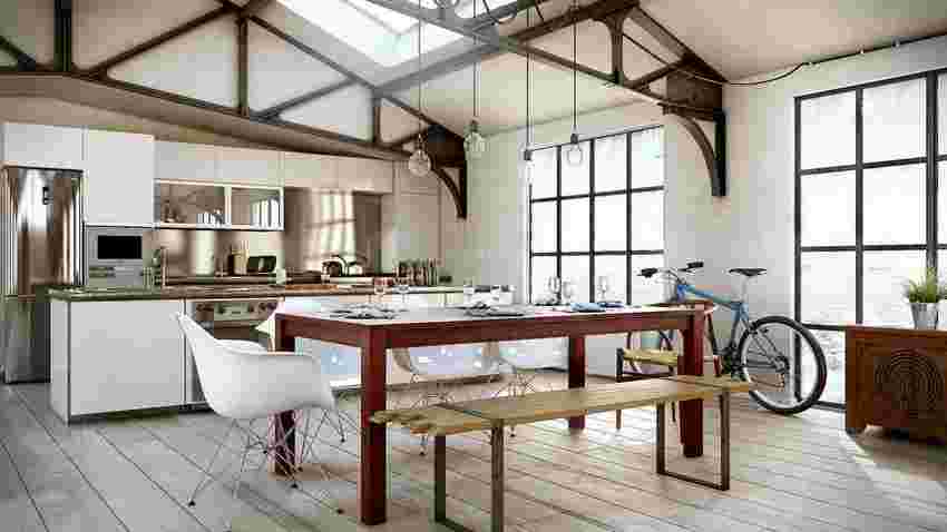 Интерьер в стиле «лофт» оформляют в светлых тонах. Такой выбор имеет несколько преимуществ: