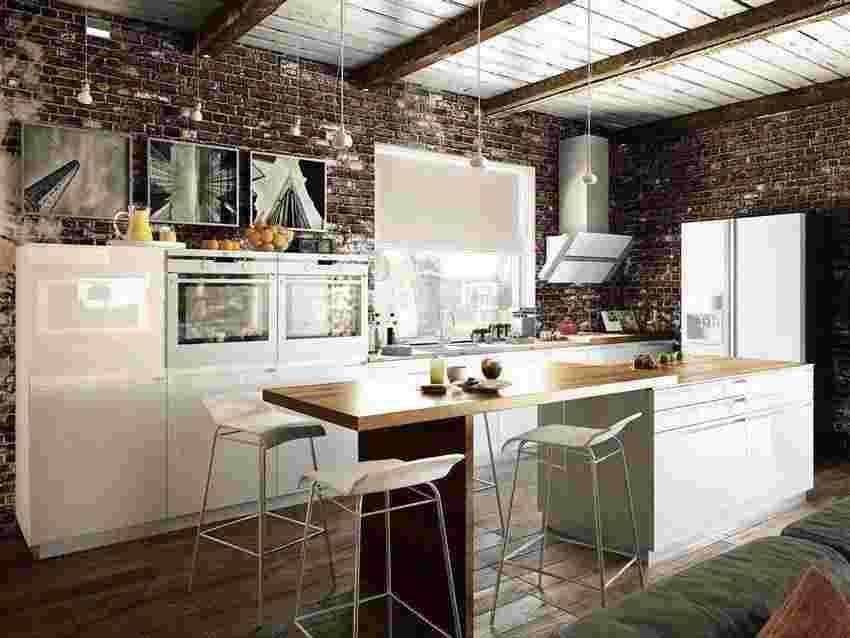Если вы решили создать стиль лофт в сравнительно небольшой стандартной кухне, то решением станет – белый кирпич. В этом варианте уже мебель и кухонный гарнитур могут быть выполнены в темных цветах из натуральных материалов с минимальной отделкой. Дополнят интерьер массивные деревянные балки, создающие эффект оголенных конструкций перекрытий.