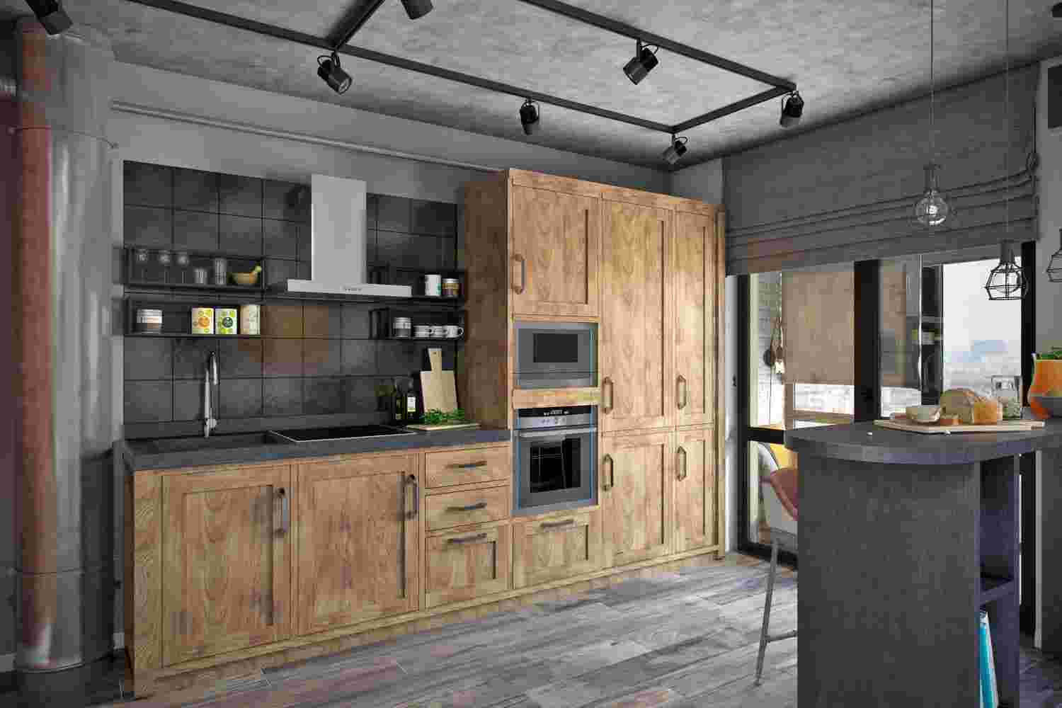 Отделка стен выглядит небрежно, нарочито грубо. Для оформления кухни используют бетон, кирпич, пластик, металл, камень.