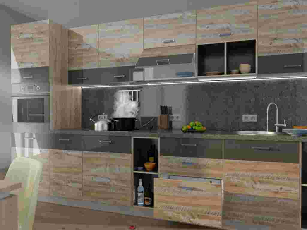 Рабочую столешницу делают из искусственного камня. Ее поверхность намеренно оставляют необработанной. Плиту и холодильник выбирают из нержавейки.