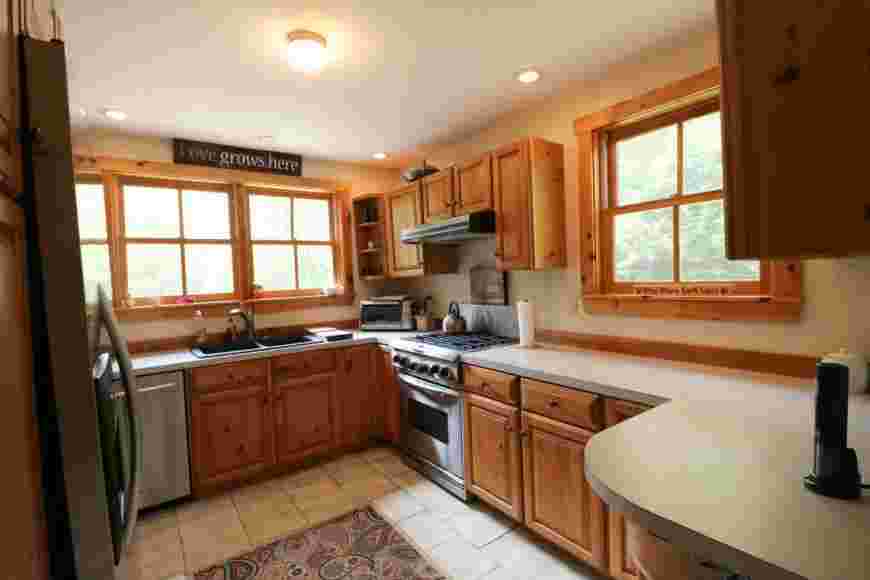 Кухня в стиле кантри манит своим деревенским шиком. Множество навесных шкафов со стеклянными дверцами позволяют сэкономить полезное кухонное пространство.