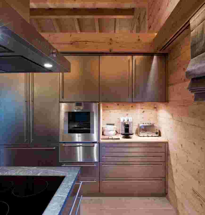 Кухня в стиле шале — помещение исключительно функциональное. Здесь минимум декора, точная планировка и компактная расстановка предметов обстановки. Раньше кухни были единым помещением с гостиной, теперь же они размещаются на цокольном этаже — там в старину был погреб.