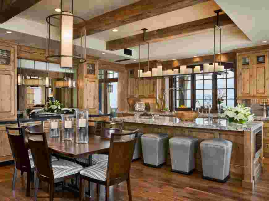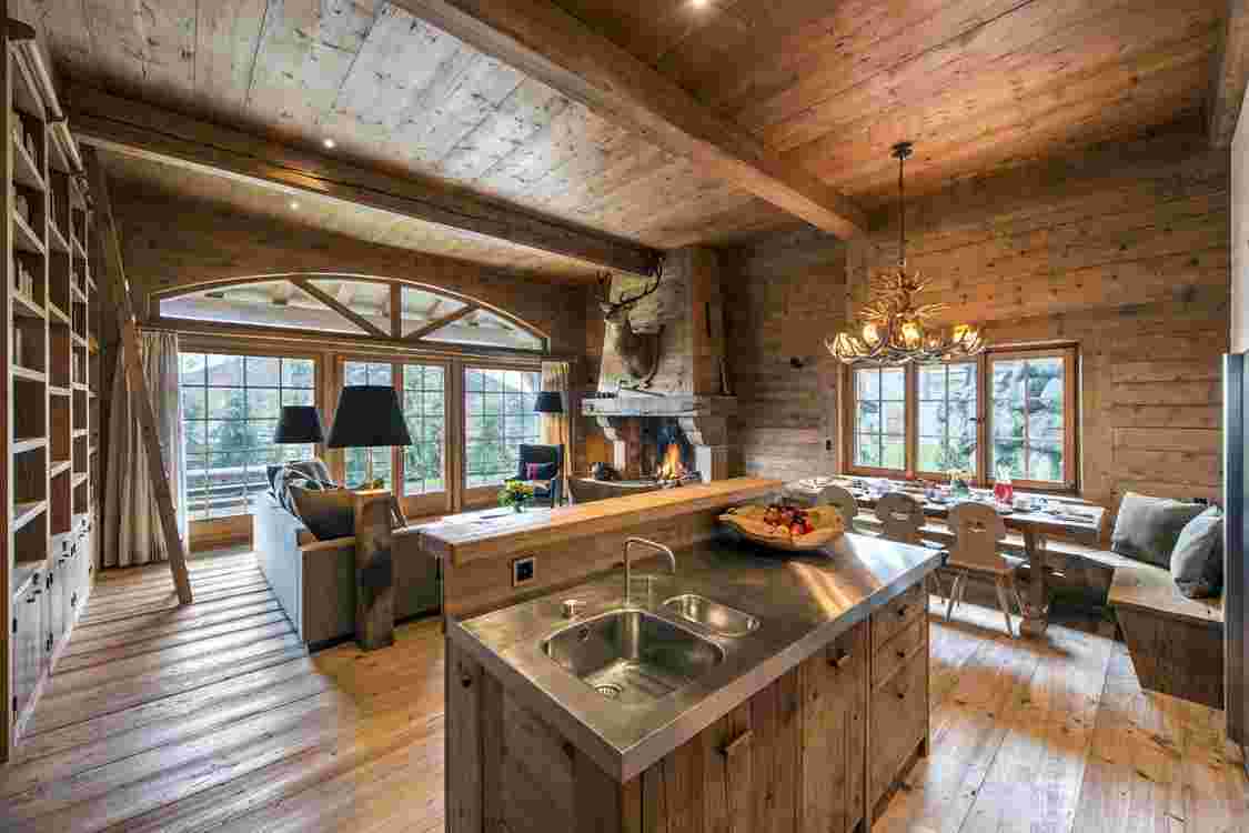 Объединение нескольких пространств в одно (когда кухня совмещается с гостиной) — характерная черта стиля, и подобное решение больше подходит для загородного дома. Такая кухня-гостиная в стиле шале зонируется при помощи предметов мебели, света или различной по цвету и текстуре отделки.