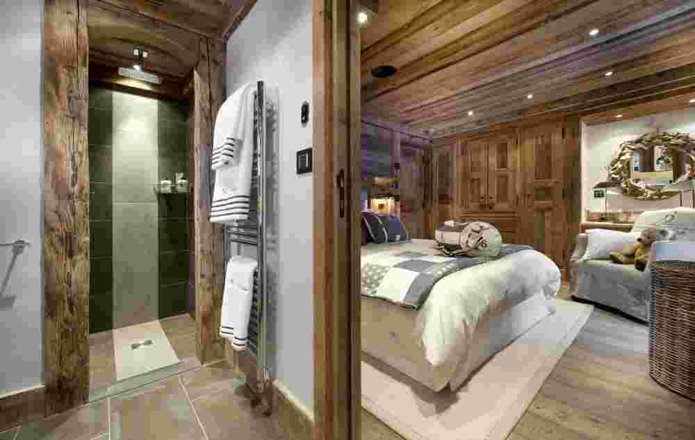 Проекты шале предполагают применение тяжелых деревянных дверей. Их украшают резьбой, венками из высушенных душистых трав. Полом служат некрашеные массивные доски, покрытые лаком (или морилкой). Иногда дерево искусственно состаривают. Полы принято украшать коврами и шкурами животных.