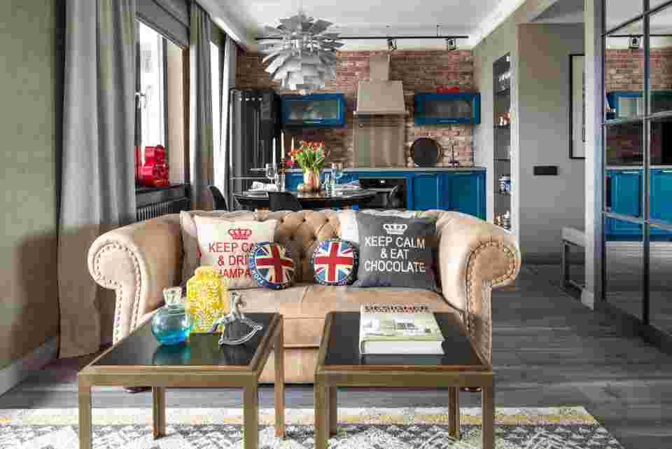 Характерной особенностью можно считать обязательное наличие большого количества посадочных мест.Мягкая мебель может быть сделана в разнообразнейших стилях. Именно в таком помещении допустимо сочетать вещи абсолютно несопоставимые и разностильные.