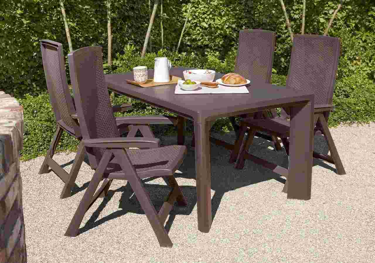 - Плетеной – выглядит интереснее и более оригинально, чем литая мебель. Из-за того, что при ее изготовлении используют тонкие полосы пластмассы, она не такая надежная. Хотя срок службы пластика длительный, ухаживать за ним приходится аккуратно.