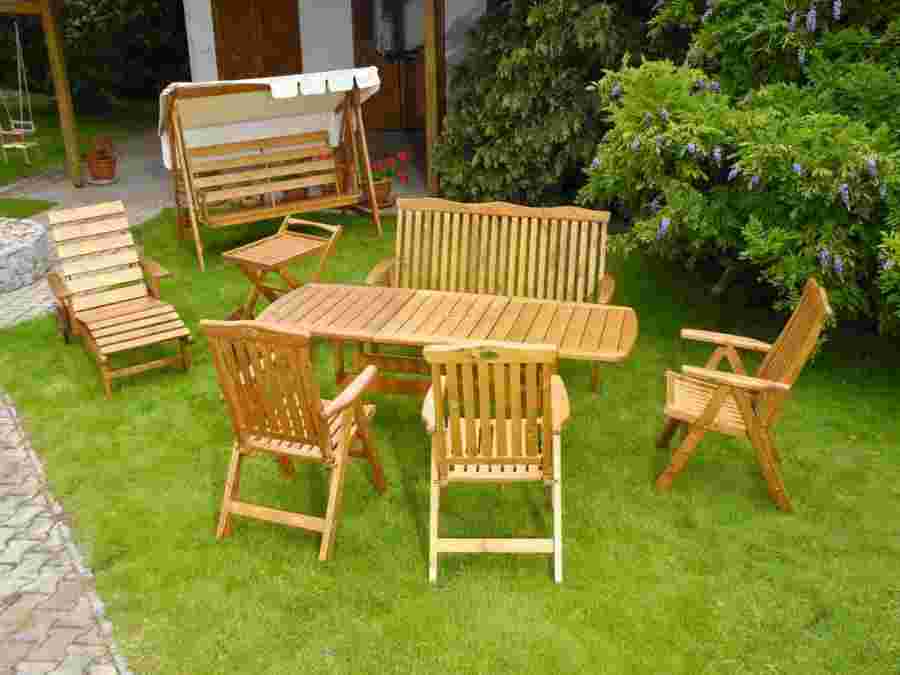 - Мебель из хвойных деревьев или тика. Такие гарнитуры стандартно обработаны антисептиком, стойкой краской и лаком, не боятся атмосферных осадков, не гниют. Для элитных загородных участков можно даже подобрать деревянную мебель под старину. При этом стоит помнить, что ухаживать за такими изделиями нужно регулярно: красить, покрывать лаком. Лучше выбирать мебель, которая мало весит — в случае проливного или затяжного дождя ее можно будет занести в укрытие.