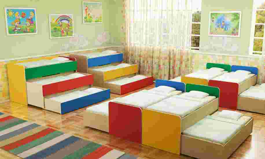 В спальне можно использовать классические, раскладные или трансформируемые выдвижные кровати с бортиками, которые помогают экономить место. Это актуально для небольших помещений и спален, организуемых в групповой комнате. Кровати подбираются под рост детей.