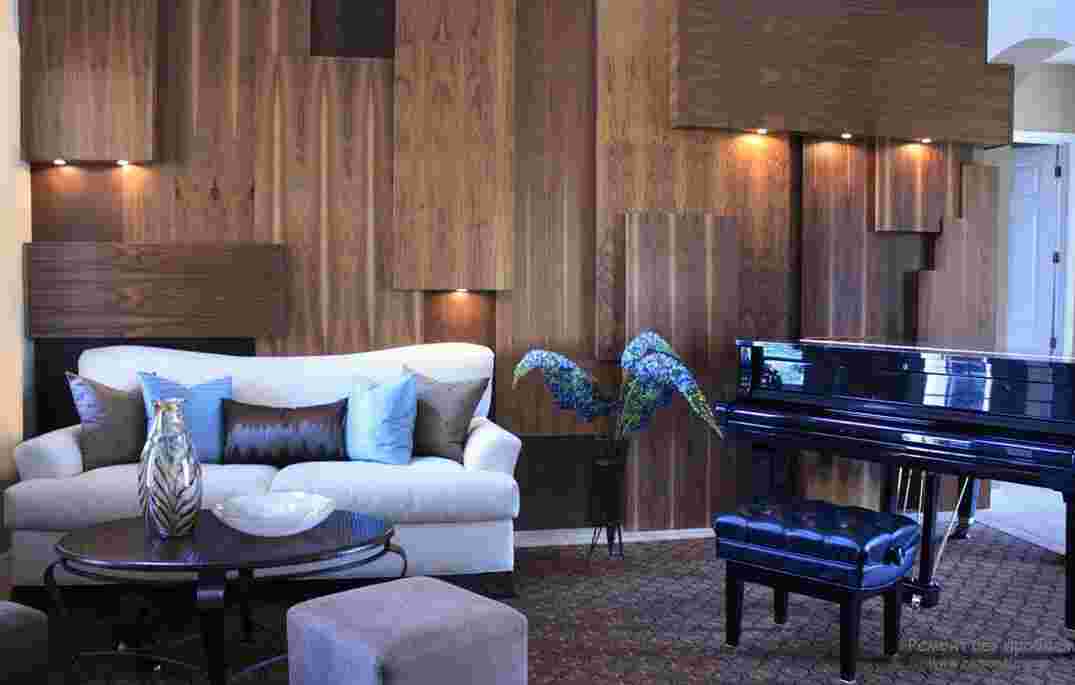 Заметно выраженную текстуру дерева подчеркнут встроенные в нижние торцы плит светильники. Такая обстановка выглядит дорого и роскошно.