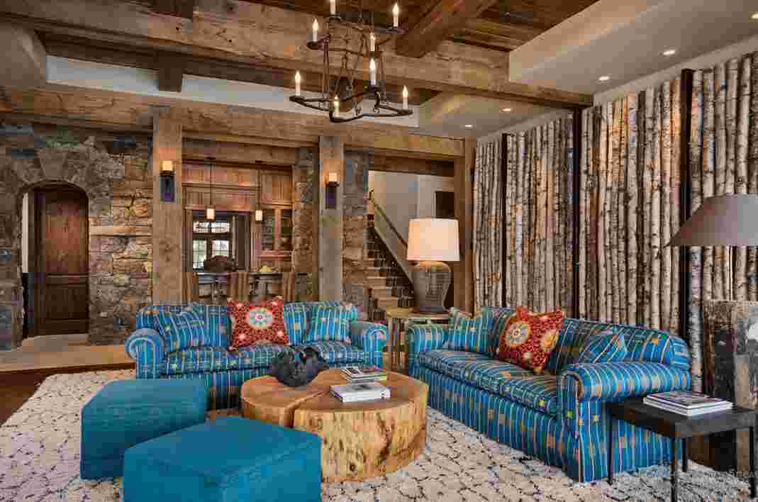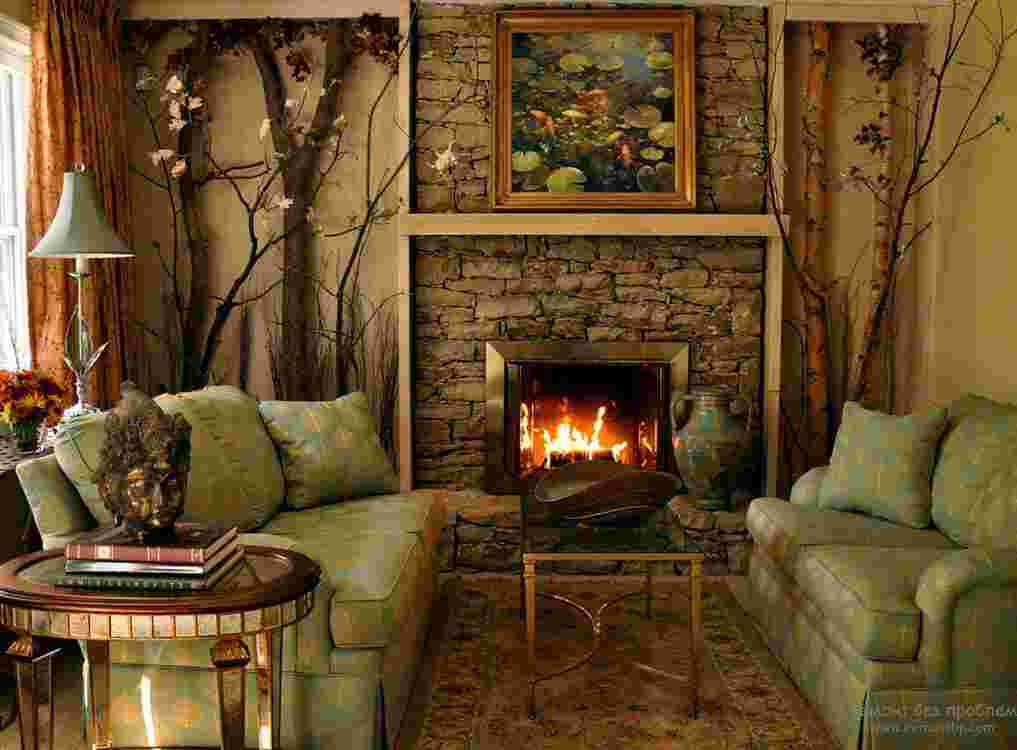 На фото деревянная стена и камин из дикого камня напоминают об истоках и наполняют комнату уютом.