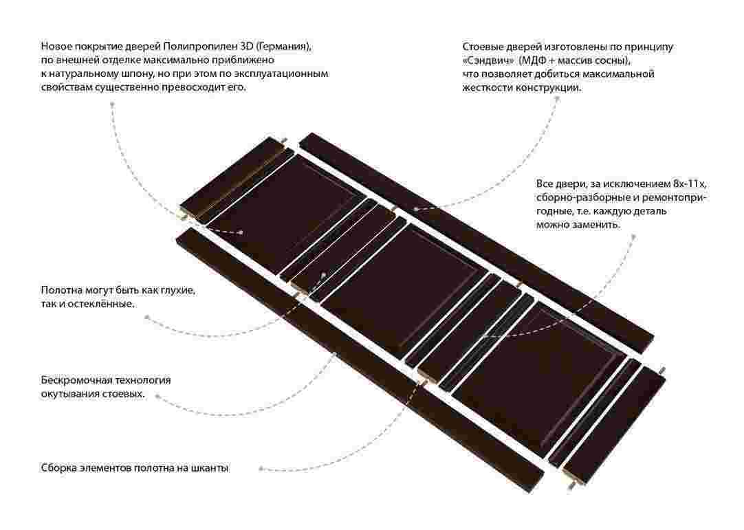 При изготовлении внутреннего слоя применяют сращенный брус. Все дело в том, что в процессе производства дверей или мебели остаются хорошие кусочки вполне качественных и дорогих частей дерева. Они склеиваются друг с другом и в результате получается изделие нужной длины и ширины. Такое дерево не подойдет для внешней отделки двери, но в качестве внутреннего наполнения подходит идеально. Несмотря на то, что такая технология более дешевая, двери из клееного массива также относят к элит-классу.