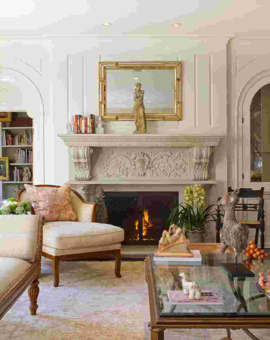 Камин является практически ведущим элементом дизайна гостиной в классическом стиле. Портал облицовывают каменной кладкой, оформляют мрамором, украшают с помощью симметричных колонн и кованых деталей, сочетающихся с окружающим интерьером. Очаг наполнит обстановку очарованием, уютным теплом и придаст помещению респектабельности.