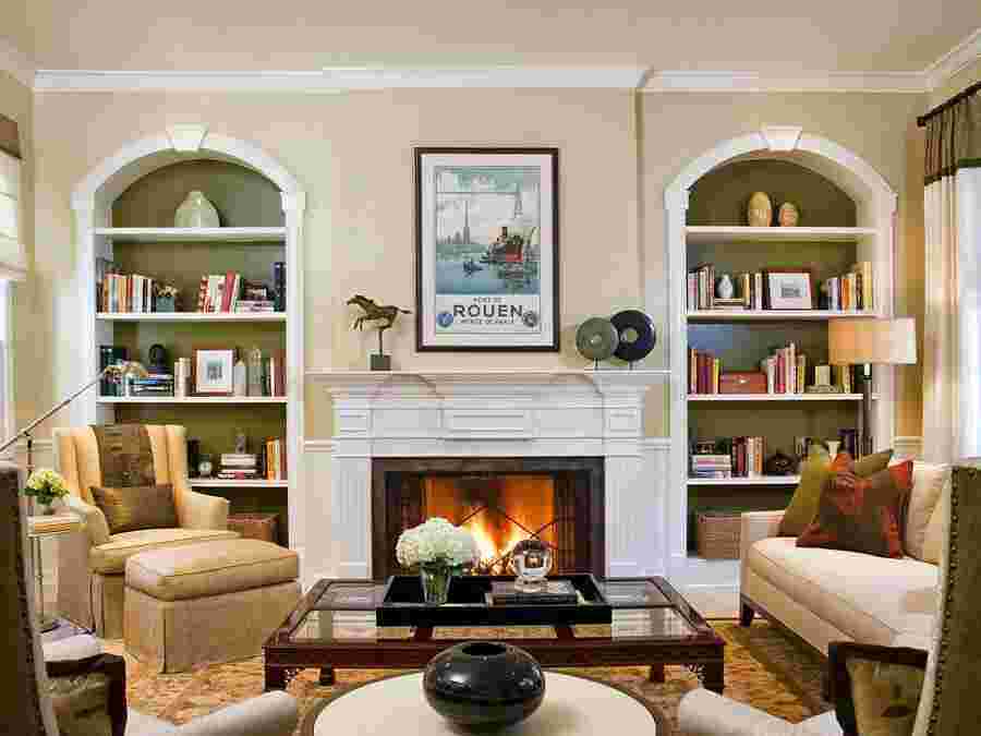 Но не только размеры определяют комфорт. Композиционным центром гостиной в стиле неоклассика выступает диван, который образует своеобразный островок в интерьере. Обычно рядом с ним расположены несколько кресел, пуфик и журнальный столик. Напротив — книжный шкаф со встроенным телеэкраном. Идеально, если в комнате установлен камин — он станет главным украшением зала.
