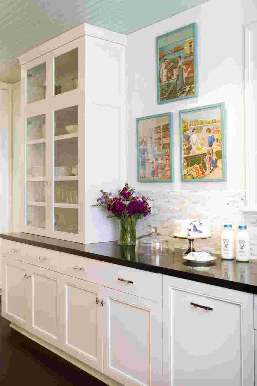 Идеально подойдет П-образный или параллельный кухонный гарнитур, выкрашенный в светлые оттенки, но более компактные модели тоже будут смотреться уместно. Чтобы не перегрузить интерьер декором, можно приобрести несколько шкафов с застекленными фасадами, демонстрирующими красивый сервиз. Если площадь позволяет, следует выделить для столовой отдельную комнату.