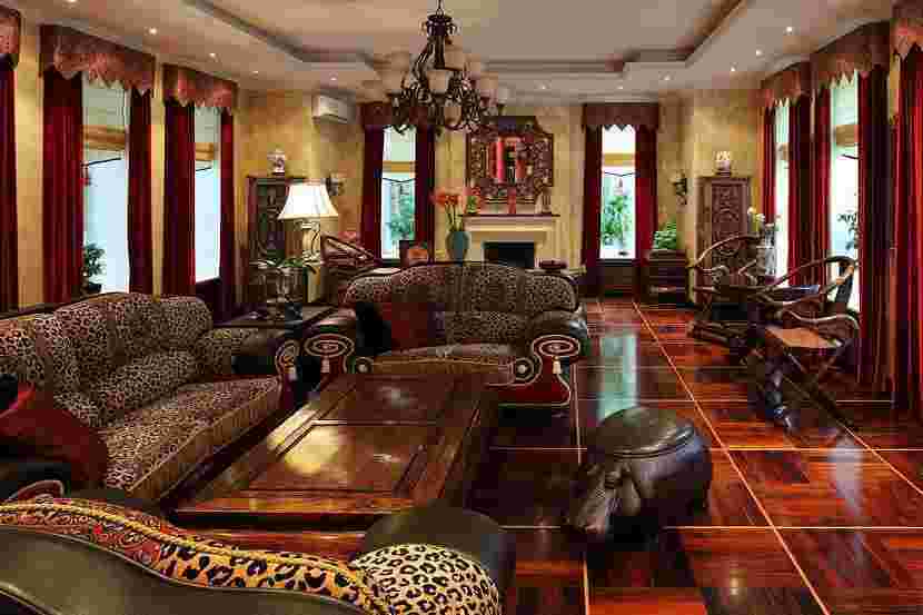стиль рококо в интерьере, однако в колониальном оформлении нет никакого блеска, неимоверной роскоши и шика. Все достаточно просто. Потолки, правда, обычно достаточно оригинальны. Мало кто останавливается на обычной покраске или штукатурке. Оформляют их с помощью деревянных балок, добавляют кожаные элементы. Стены отличаются грубой фактурной штукатуркой или обоями из натуральных материалов: ткани, джута, бамбука, уместны и панели из ротанга и натурального дерева. На полу допускается оформление плиткой, имитирующей кирпич или камень, но идеальным вариантом является покрытие из мореного дуба.