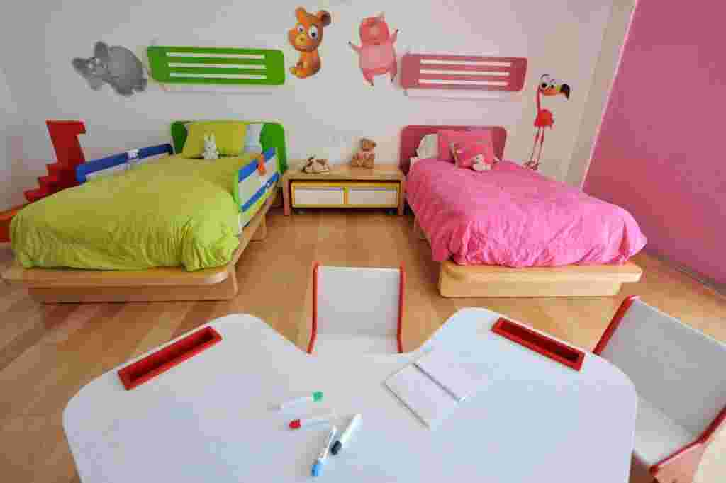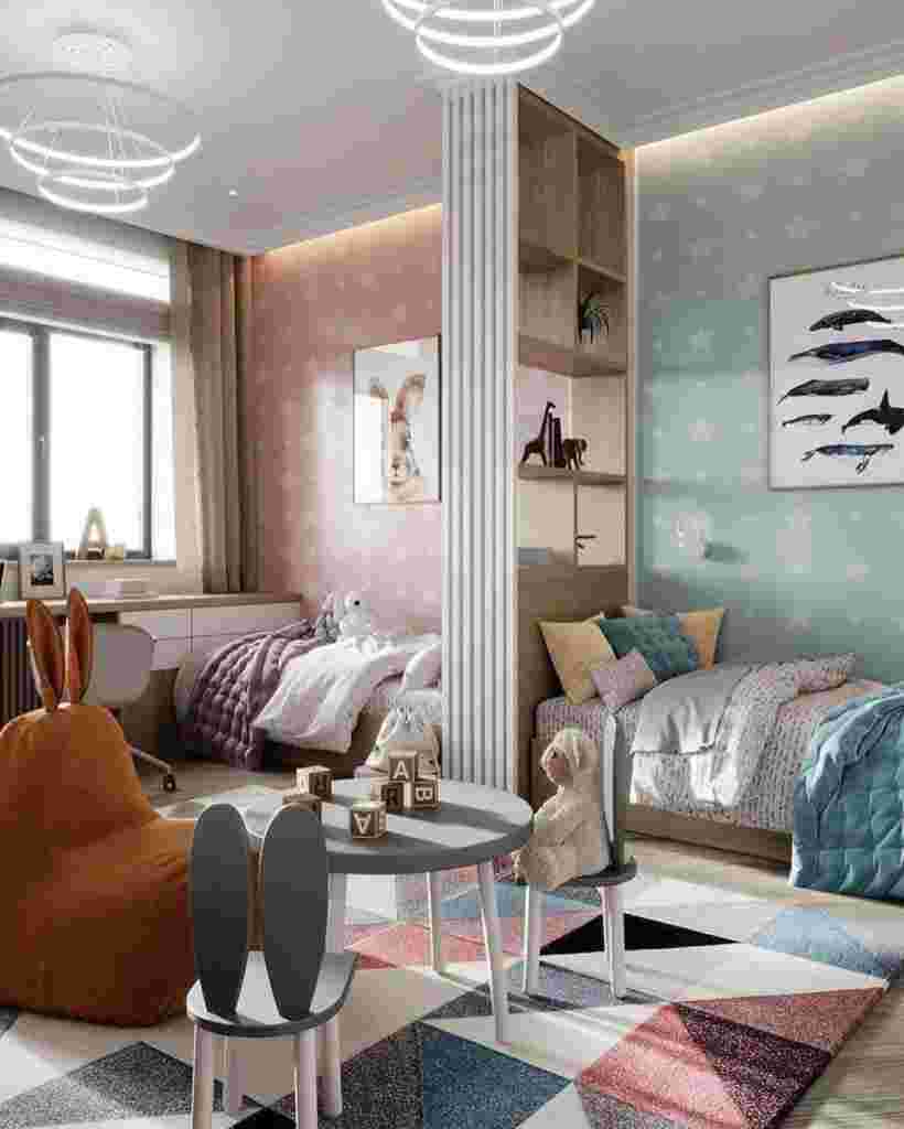Если комнату делит мальчик и девочка, можно пространство делить перегородкой и каждую половинку оформлять по-своему, но с одинаковым набором мебели. Когда пространство маленькое, разграничение пространства производится цветом.