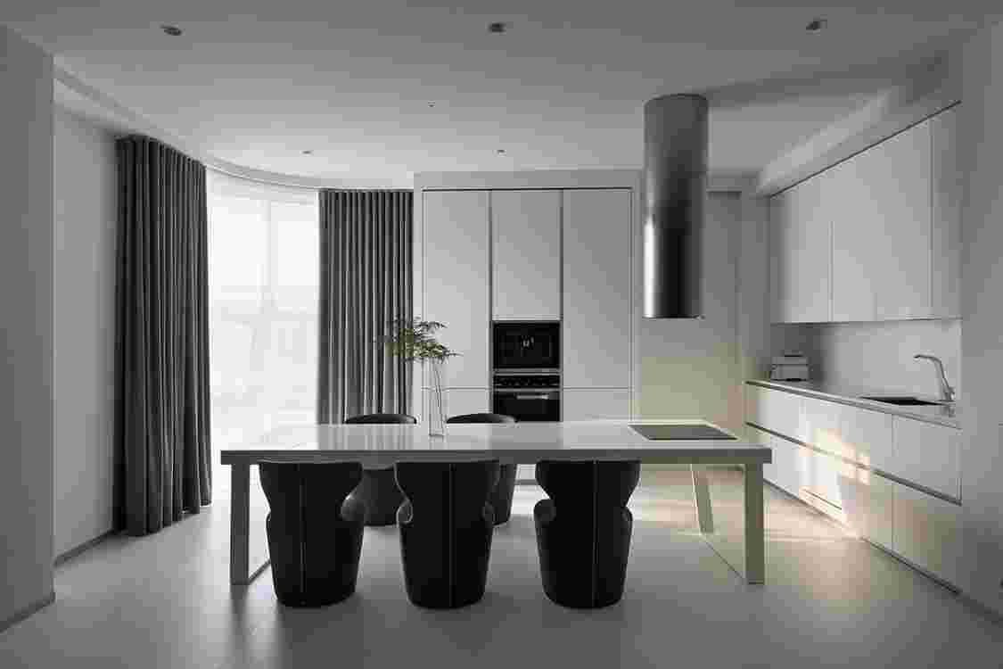 исключительно холодная цветовая гамма, разбавленная «теплым» деревом – как видите, и это не всегда так; ведь вся эта ледяная композиция может заиграть при помощи ярких стульев, фартука или небольших и немногочисленных предметов декора;