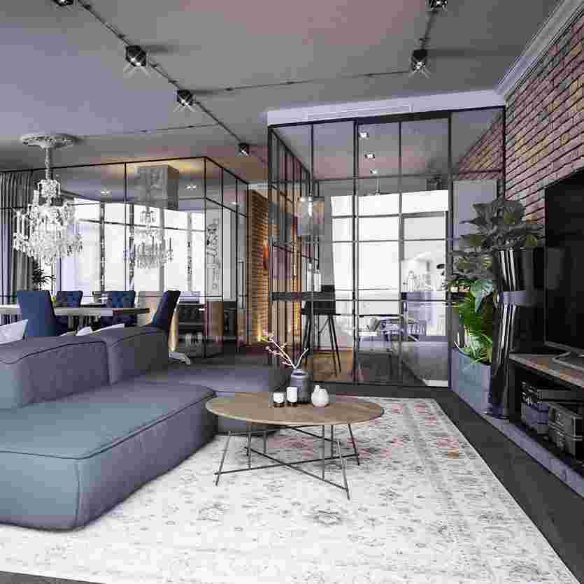Для стиля лофт свойственен отказ от стен и перегородок, но зачастую в городских квартирах невозможно полностью отказаться от стен, заменить их можно стеклянными перегородками, панелями и стенами. Современные технологии позволяют сохранить свободное пространство, установив перегородку из прочного стекла с высокими шумоизоляционными свойствами.