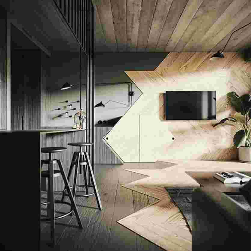 - Отделка стен деревом добавляет в интерьер тепло и уют. В дизайне лофт-кухни стены из дерева можно дополнить бетонными, кирпичными, стеклянными элементами.