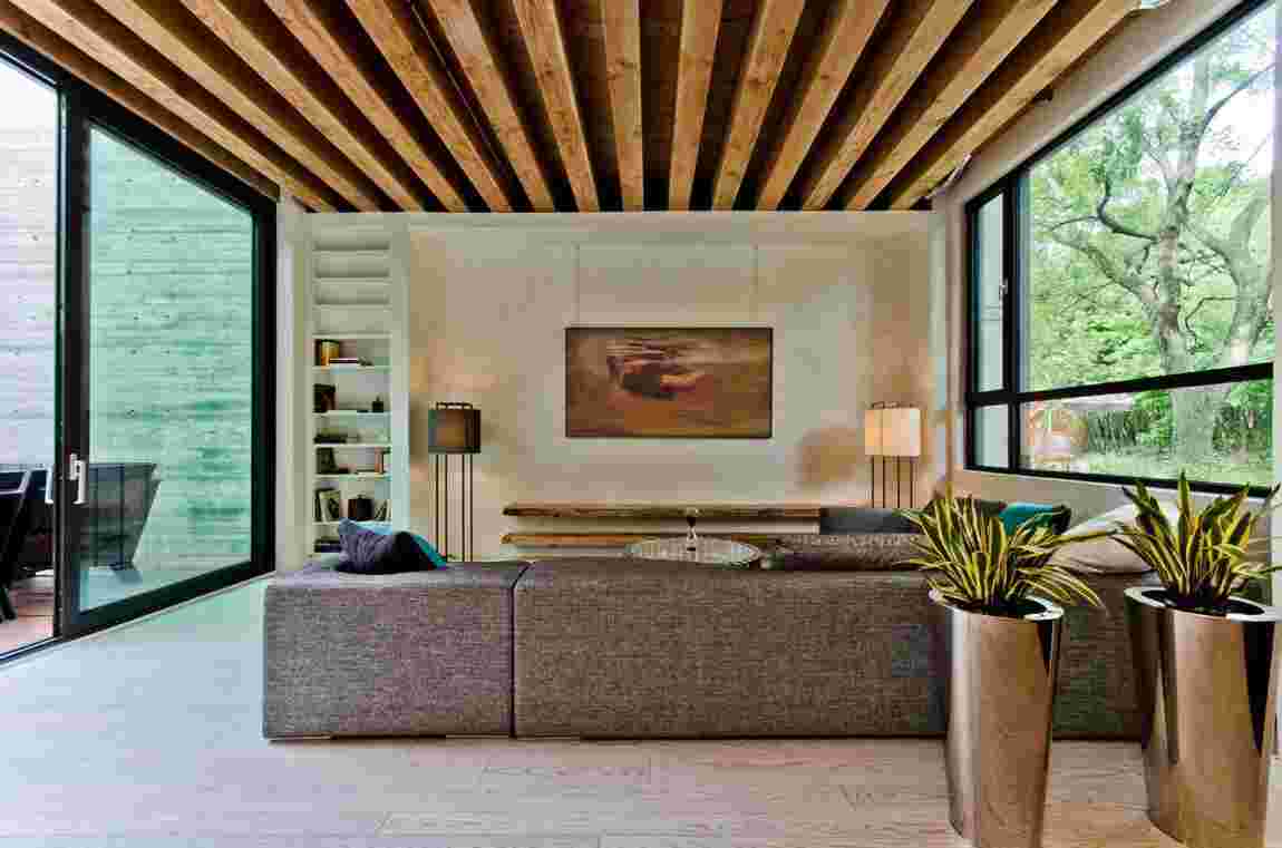 Отделка потолка и пола деревом в стиле эко-минимализм.