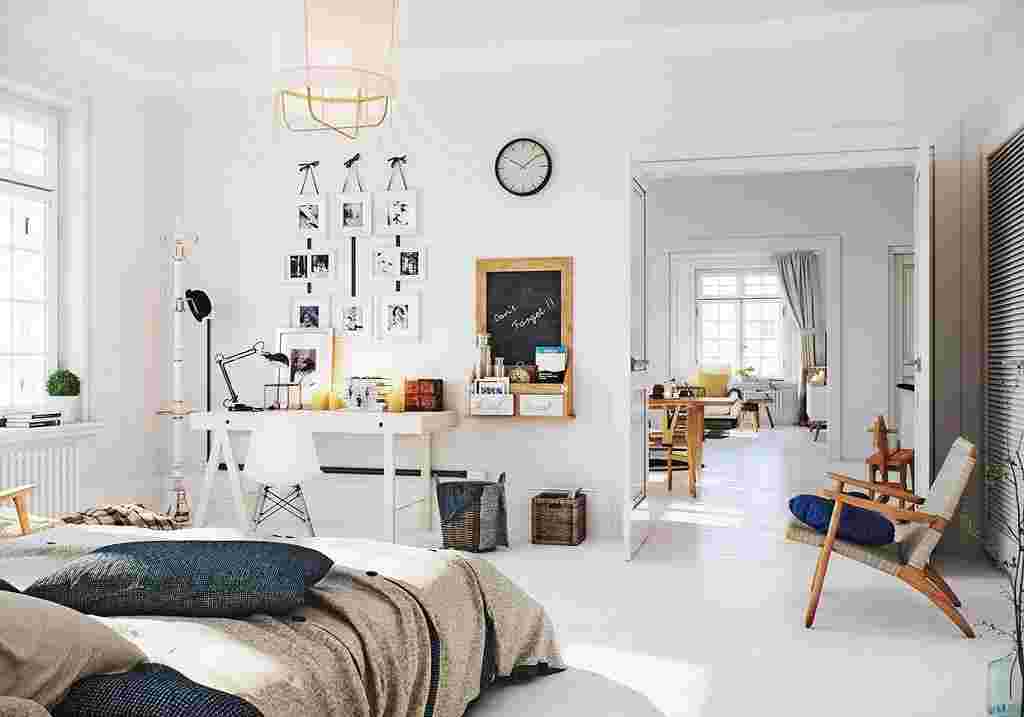 Белый цвет, характерный для скандинавского стиля, прекрасно расширяет пространство