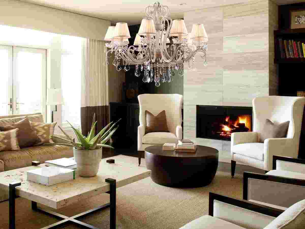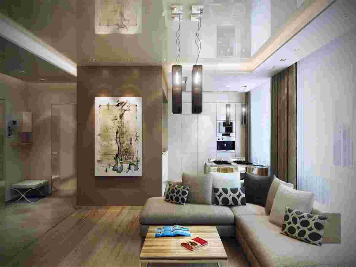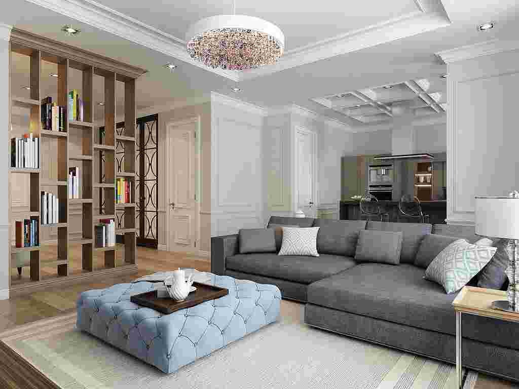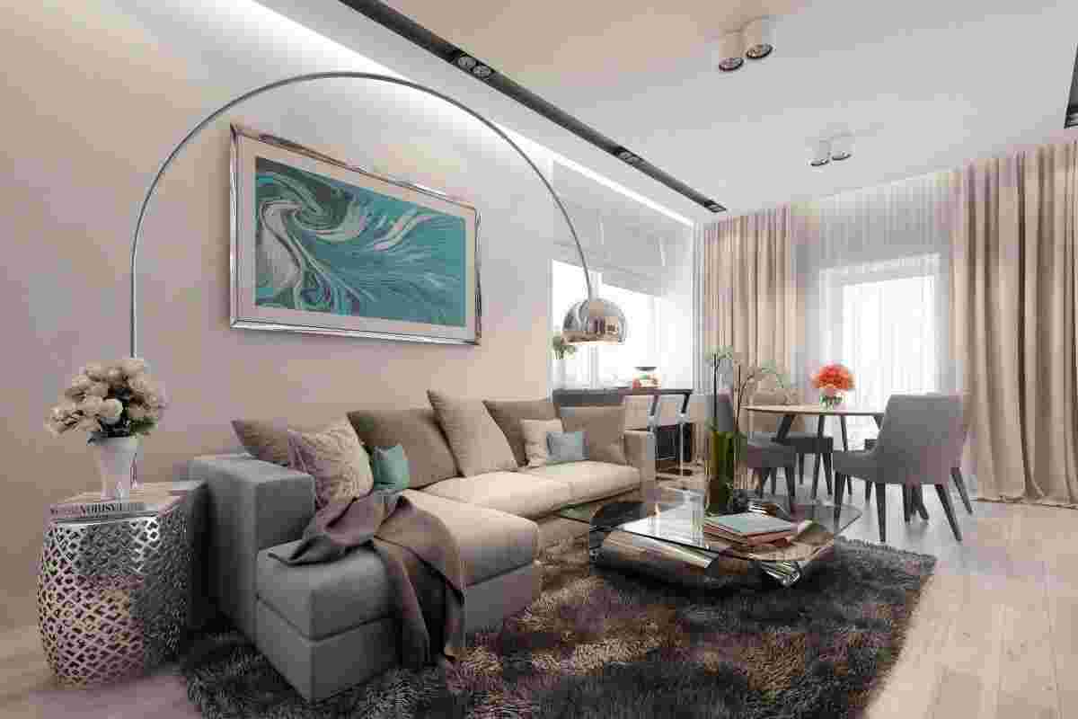 Можно поставить вдоль одной из стен серый угловой диван модульного типа с контрастными декоративными подушками, стены украсить бежевыми обоями с кружевным рисунком, подчеркнуть гостевую зону стеклянным столиком и светлым ковром, потолок и стены нарядить массивными светильниками со стеклом или хрусталем.