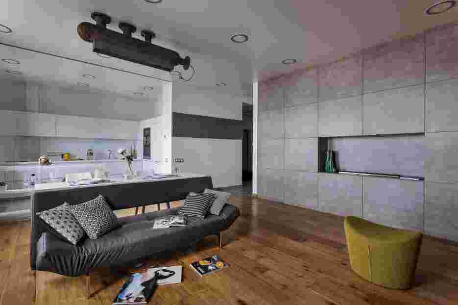Функциональность, безупречность и инновации, подчёркнутые прямыми формами и актуальным дизайном помогут создать комфортный и красивый интерьер для современного активного человека. При недостатке места в квартире, она может быть перепланирована в студию – помещение большой площади, легко разделяемое на зоны. Гостиная-студия в современной стилистике позволит получить большое пространство и при этом выделить зону кухни цветом и фактурой оформления.