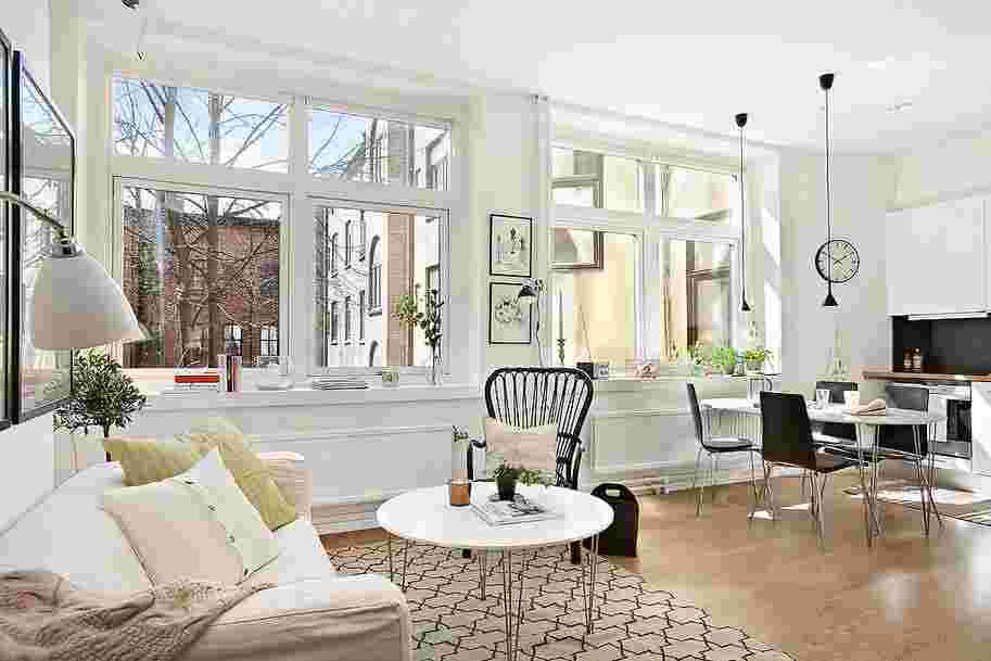 Невероятной популярностью в дизайнерских проектах пользуются скандинавские мотивы. Этот стиль имеет довольно много особенностей, что и делает его по-своему уникальным. Лаконичность оформления позволяет сохранить свободное пространство. Но в то же время такой интерьер точно будет создавать ощущение уюта для каждого члена семьи или гостя. В целом можно сказать, что скандинавский стиль немного схож с минимализмом. Он предполагает светлое, нейтральное оформление стен и мебели, а также большое количество естественного освещения. Такого эффекта можно достичь, есть отказаться от слишком плотных и темных штор. В гостиной они редко используются по назначению. Альтернативным решением могут быть рулонные шторы, тонкий тюль или даже жалюзи.