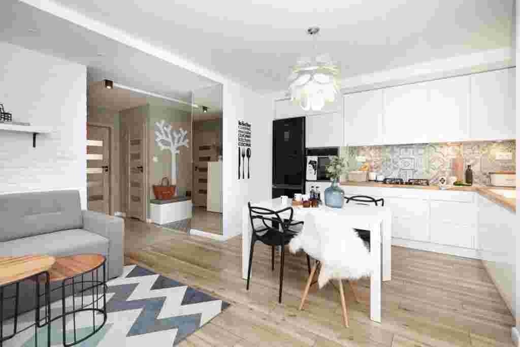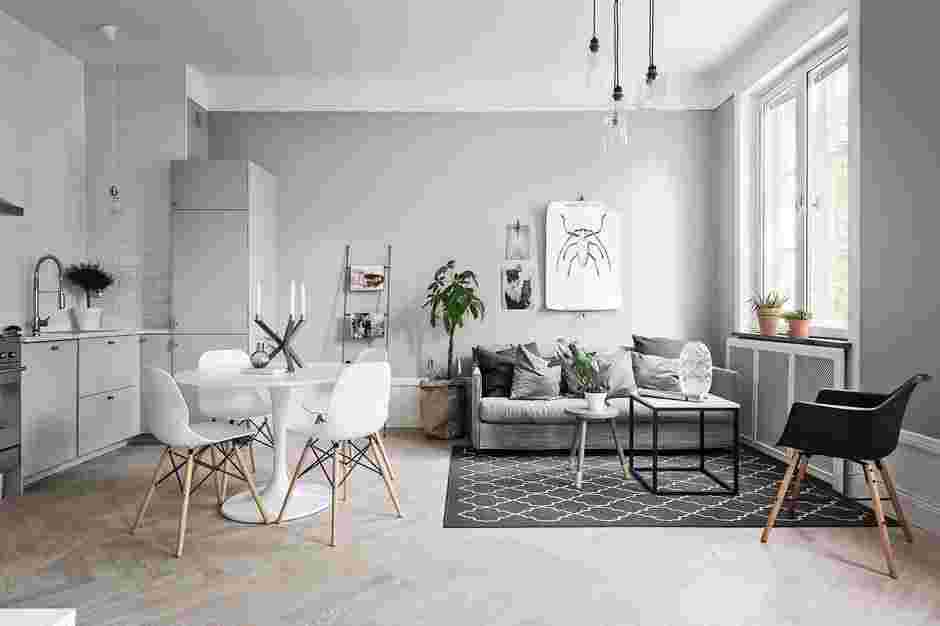 - Небольшие жилые комнаты обычно соединяются с кухонной зоной, а затем обеденный стол отделяет кухонную зону от зоны гостиной.