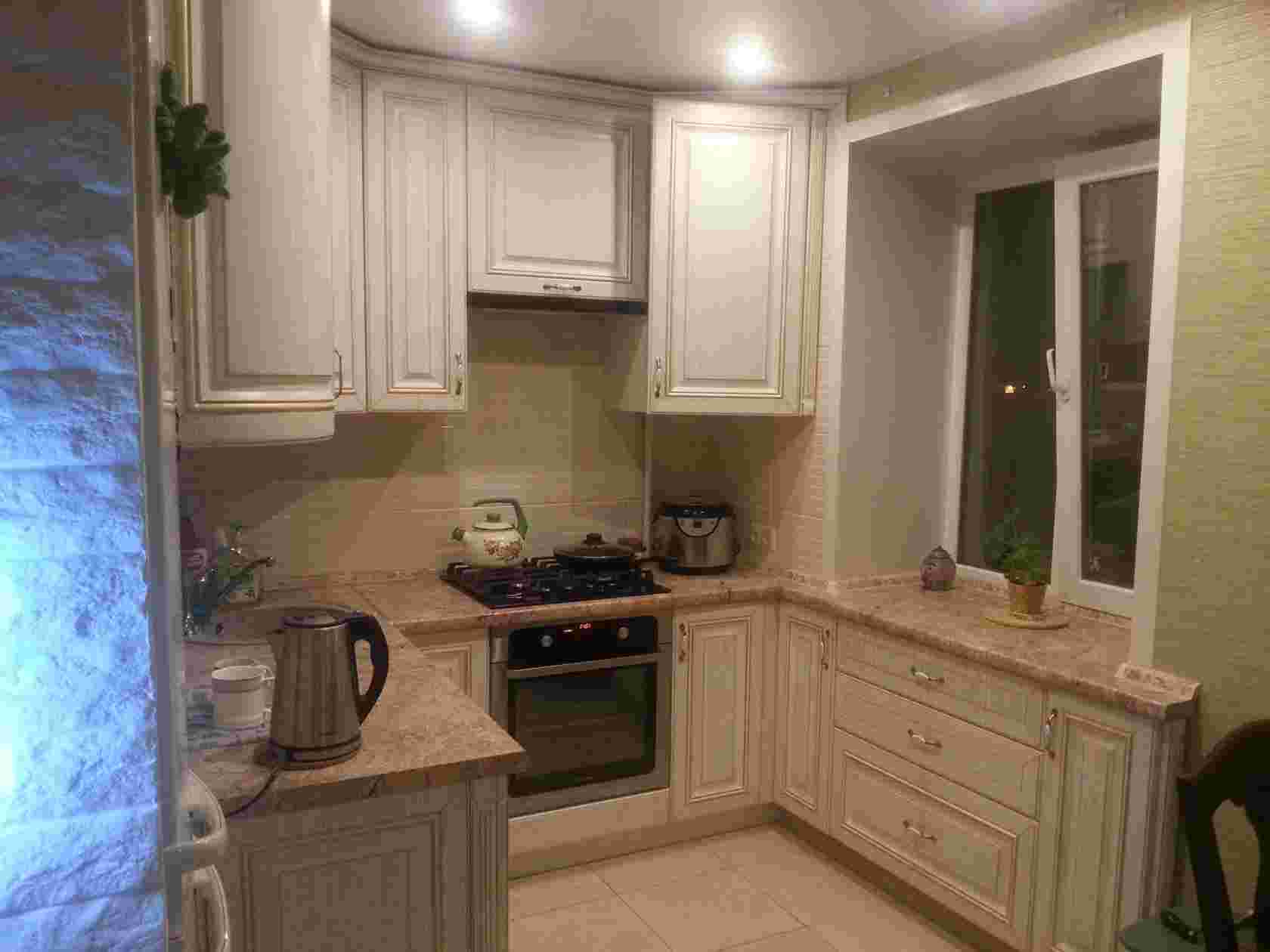 - задействование подоконника и зоны около окна в качестве рабочей при помощи удлиненной столешницы, установки мойки, встраиваемой духовки и т.д.;