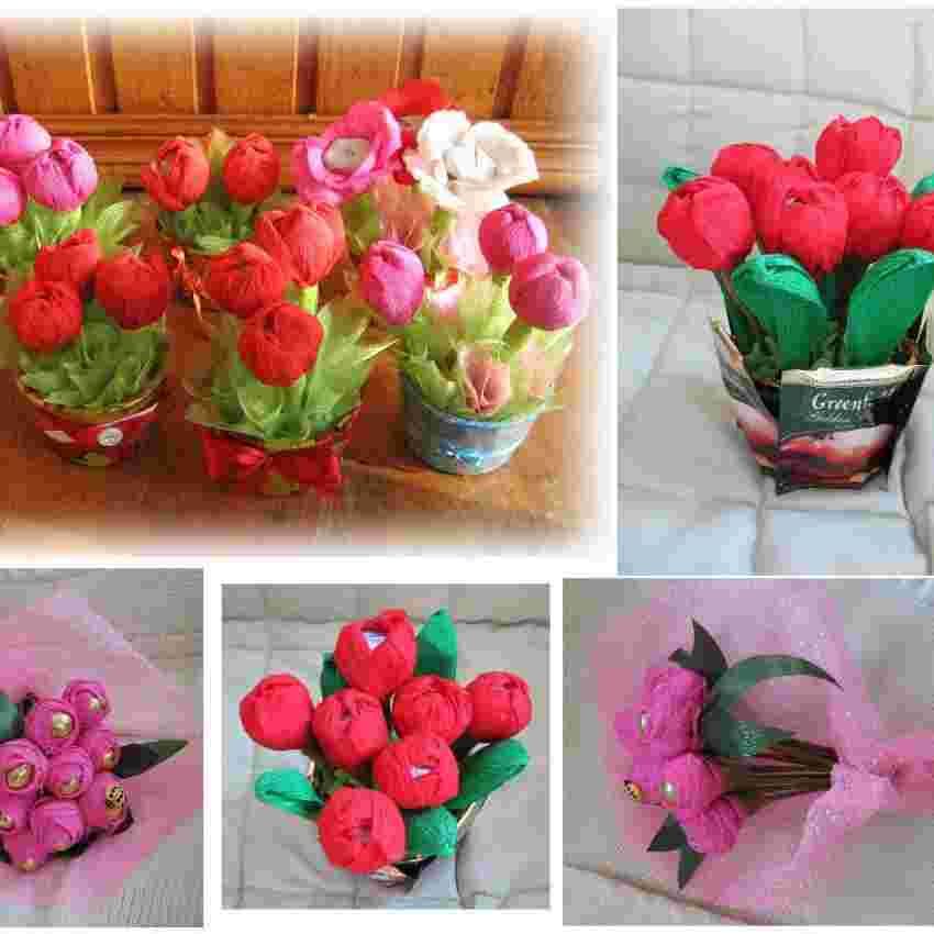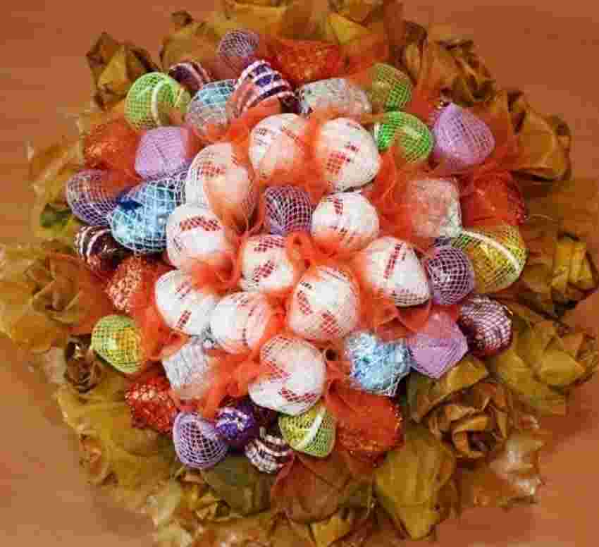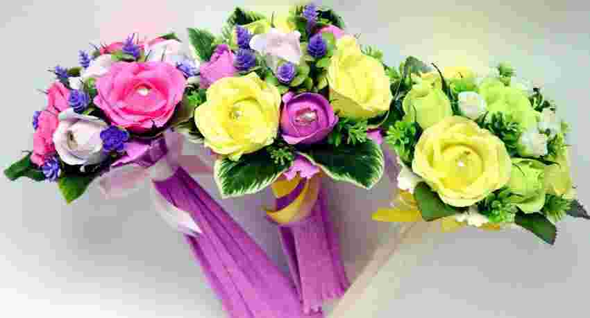 Часто цветы заменяют различными материалами, которые также могут красиво и празднично выглядеть в букетах. Такой букет цветов своими руками сделать очень легко, это не требует особых навыков и умений.