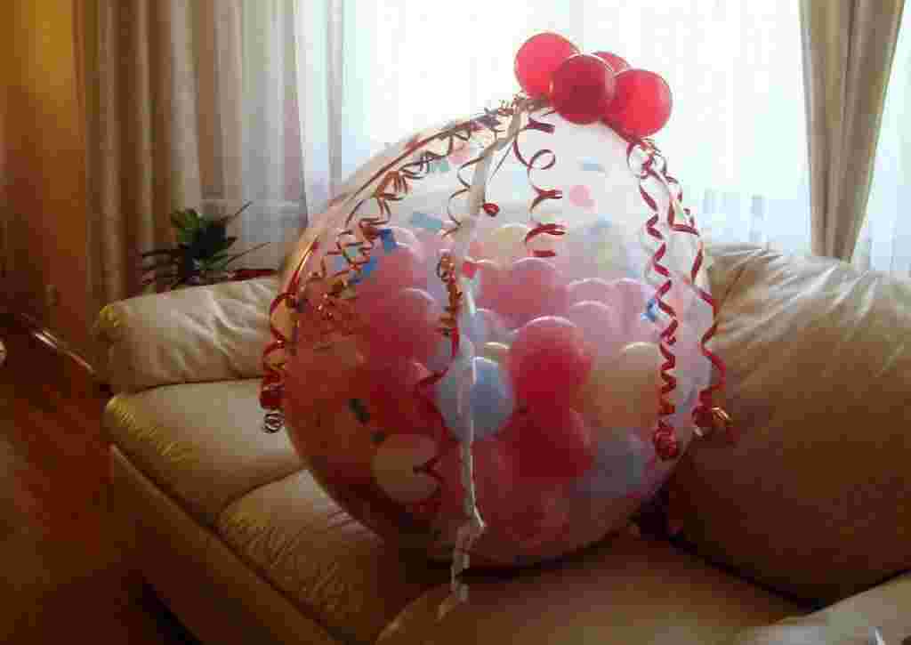 - Внутрь большого шара мы помещаем конфеты, либо небольшие игрушки. Так же, для украшения можно добавить дополнительно серпантин, либо новогодний дождик. Используется этот вариант для различных детских игр, забав и соревнований. Главная цель у ребят – лопнуть шарик, после чего получить вкусное вознаграждение;