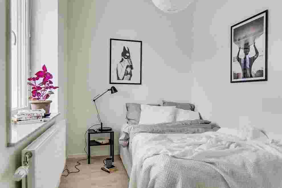 На фото маленькая белая спальная комната в скандинавском стиле.