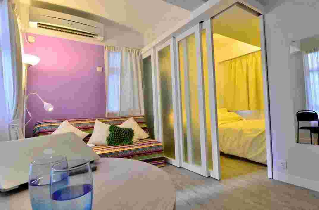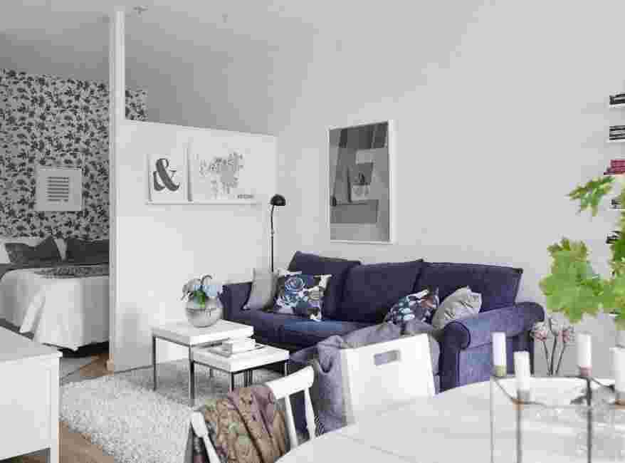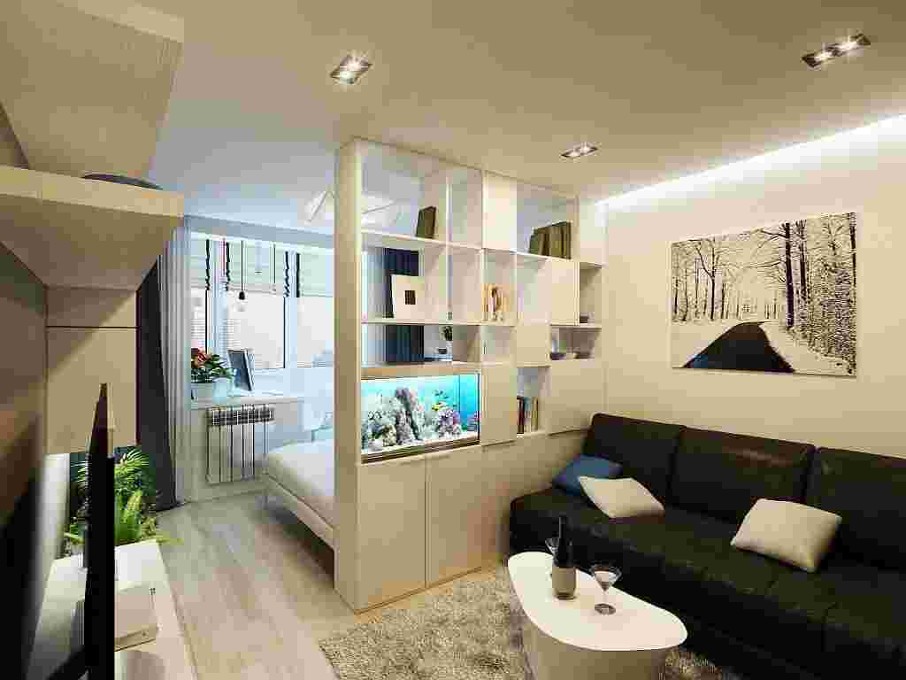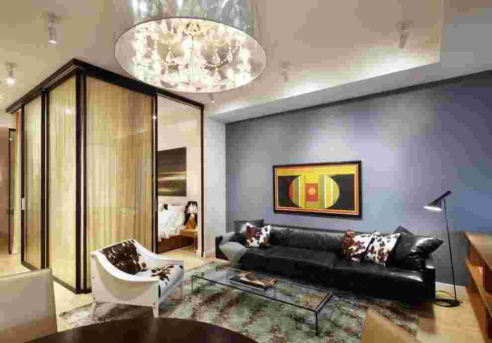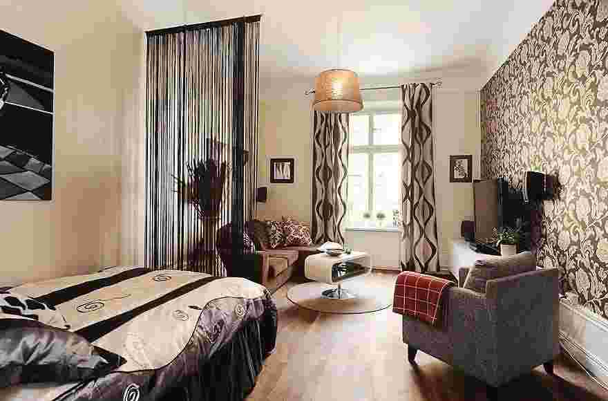 Однако вполне допустимым и даже удачным является ансамбль, состоящий из монохромного и цветастого обойного полотна. Для выделения зоны гостиной можно использовать точечные потолочные или настенные светильники, тогда как освещение в зоне отдыха оставить приглушенным. В случае визуального зонирования рекомендуется использовать мебель различного типа или цвета. При этом для гостиной лучше отдать предпочтение более вычурной фурнитуре, а спальню оформить в стиле «строгой» функциональности. Отличным вспомогательным элементом могут служить мягкие чехлы и накидки, а также правильно подобранные комплекты постельного белья. В качестве «разделительной полосы» в интерьере применяются не только привычные бытовые предметы, но и самые экзотические конструкции: аквариумы или террариумы, декорированные поленья и пни, потолочные подвески и даже плетеные сооружения по типу соломенного тына.