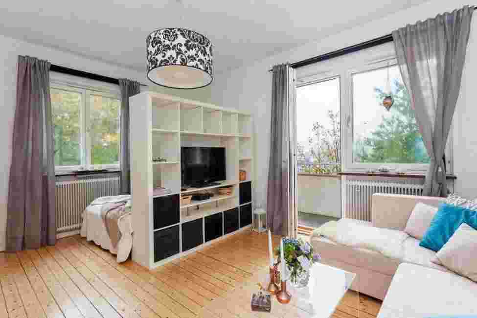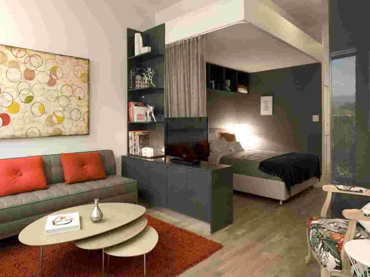 Это наиболее доступный вариант, он же – самый практичный для малогабаритной квартиры. В качестве разделителя могут выступать шкаф-купе, двусторонний шкаф, стеллаж или мебельная горка. С этой функцией отлично справляется современная многофункциональная мебель. Сплошной фасад можно декорировать в любом стиле, а также прикрепить к нему несколько полочек, повесить зеркало, картину, телевизор или комнатные цветы. Там, где совсем не хватает свободного места, можно установить шкаф с откидным столом или кроватью.