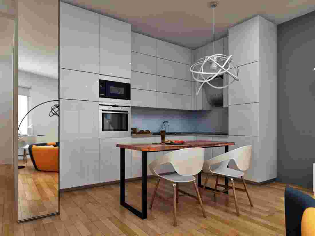 Встроенные полки для хранения инвентаря, скрытые за сплошными фасадами с потайным механизмом открывания, прекрасно сочетаются со стеклянной столешницей. Это не только футуристично выглядит, но визуально раздвигает пространство. Но если помещение кухни большое, можно отдать предпочтение традиционной деревянной мебели, следя лишь за тем, чтобы на ней не было декоративных элементов.
