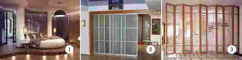- складные стеклянные перегородки. Различие заключается в точке фиксации полотна.